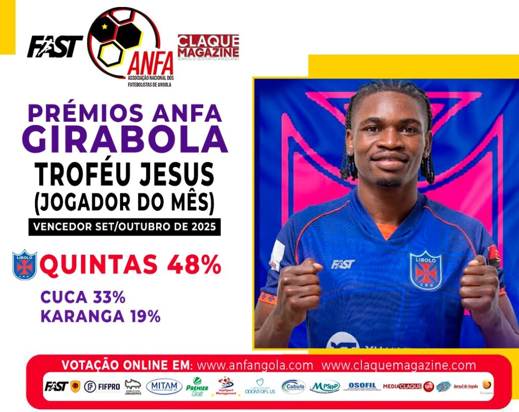 Por fim, o Troféu Jesus, que distingue o melhor jogador do mês no Girabola, foi para Quintas, também do Recreativo do Libolo, igualmente com 48% dos votos. O avançado destacou-se como a principal referência ofensiva da sua equipa, combinando golos e assistências que consolidaram o bom momento do Libolo no campeonato. Cuca (CD Lunda Sul) e Karanga (Wiliete) completaram a lista dos finalistas.